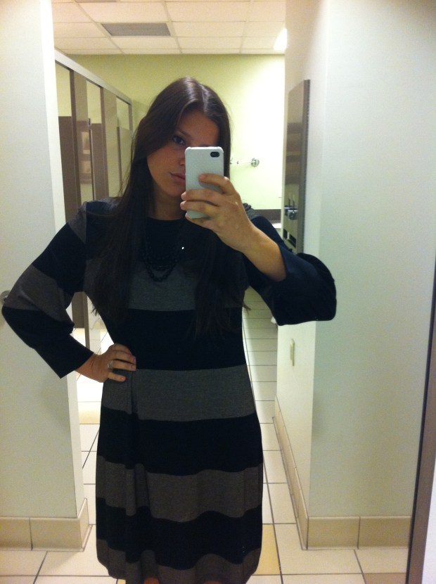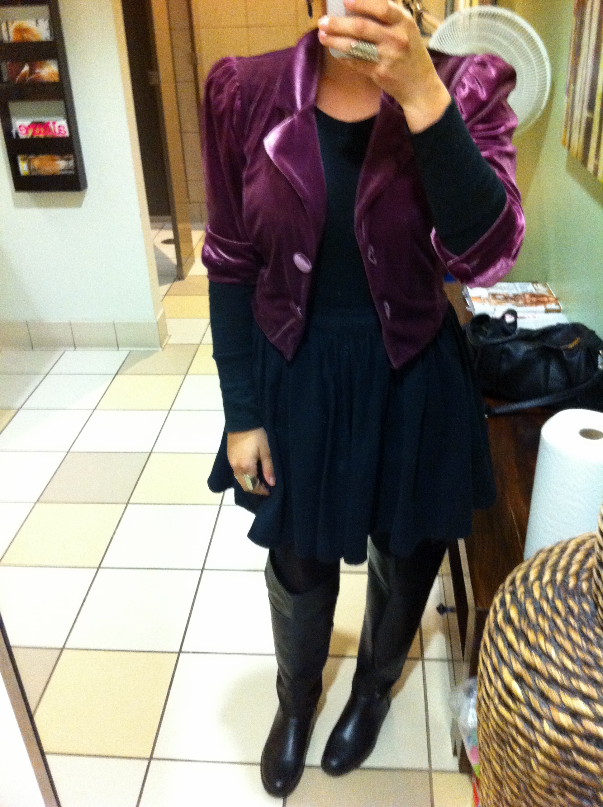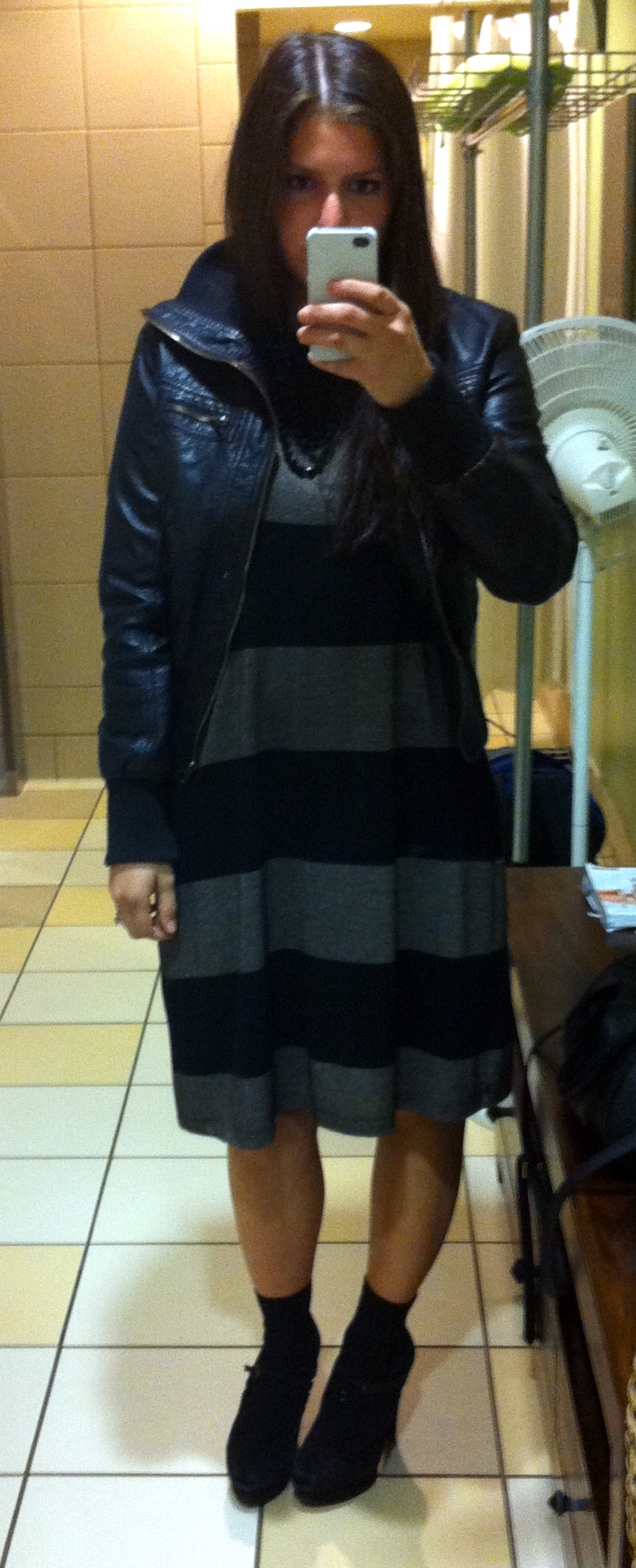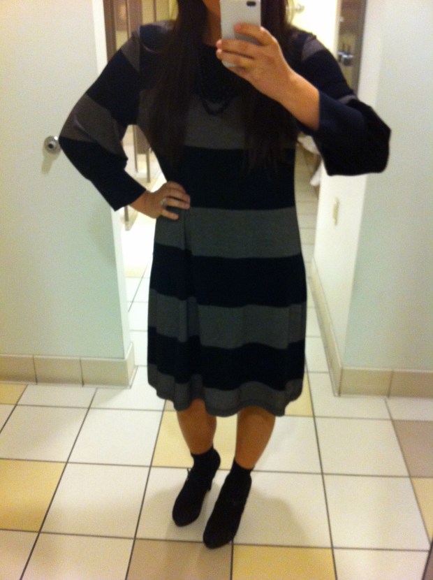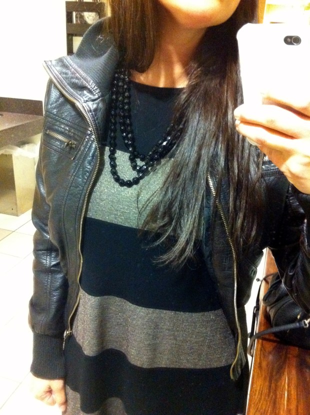 (what i wore: sweater dress – bcbg from daisy exchange, socks – forever21, heels – nine west, jacket – tj maxx, necklace – dillards)
