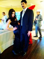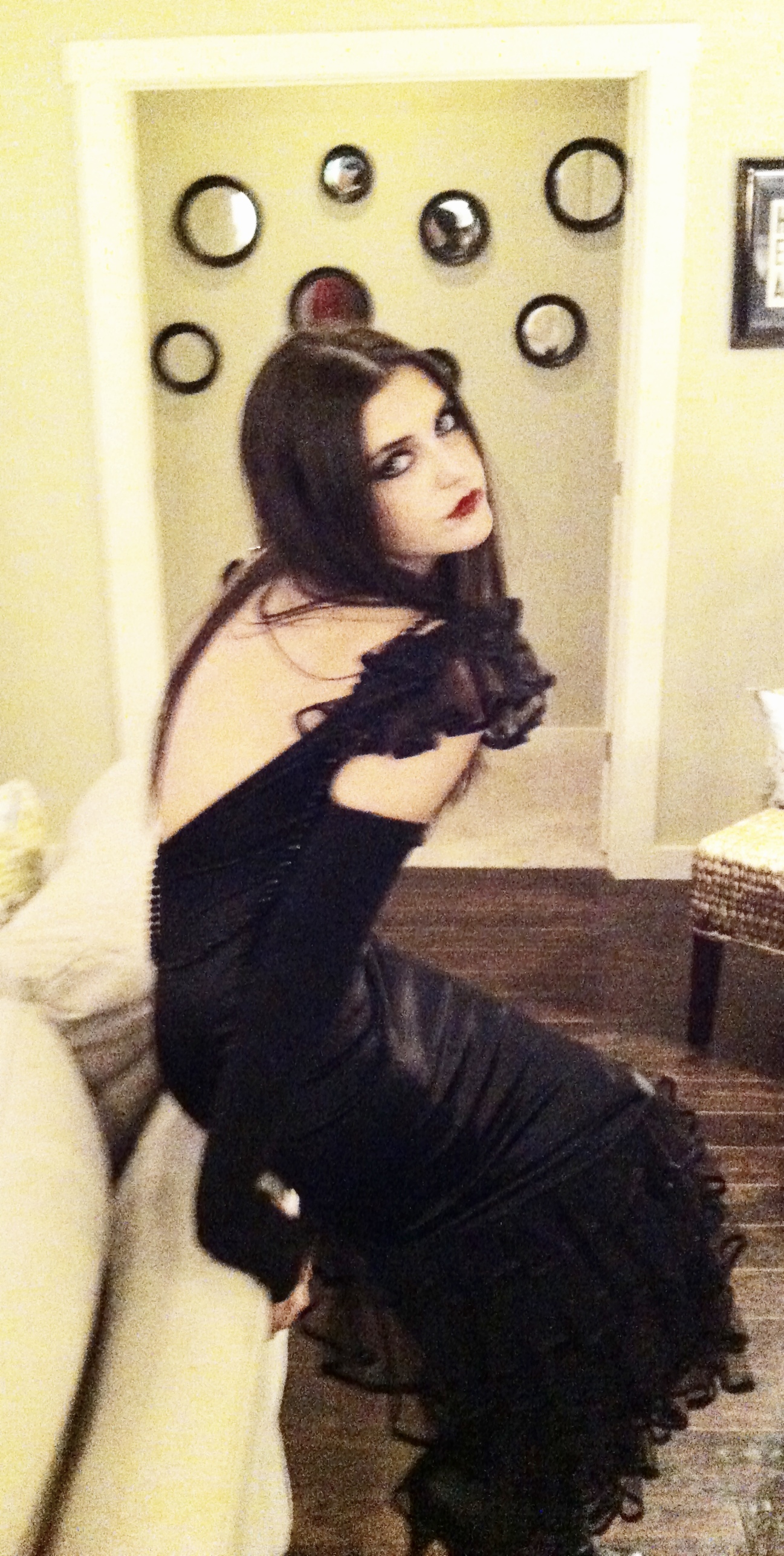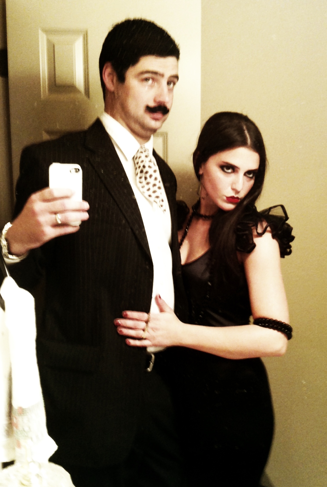 For someone who loves clothes and dressing in general, Halloween is a veritable holiday. I always look forward to it and this year I found my costume in the form of this spandex dress early this summer. I knew I had to have the dress but honestly couldn’t foresee any appropriate occasion. Then…a light bulb: Morticia Addams (a la Anjelica Huston of course). I’d been devising and conniving for months but it didn’t really come together until late last week when I found the perfect suit for Ro’s Gomez. Ro will pretty much dress as whatever I suggest but he cannot be counted on to procure his own costume. You may find it hard to believe but I really don’t mind shopping for him. It was as if the stars aligned, I was attempting to find a semi-suitable suit for him without him present which is next to impossible. I happened upon a gray Halston pinstripe ensemble at a local thrift store that was listed at $20. I thought it might be close enough to his size but I wasn’t sure and if it happened to be too small or too short, I would be out $20, which I never enjoy, even with a bargain. I got it home and it literally fit better than some of his tailored suits. I was in thrifted nirvana. We had a fabulous time and I had an excuse to look sullen in photos – which of course, I don’t need.