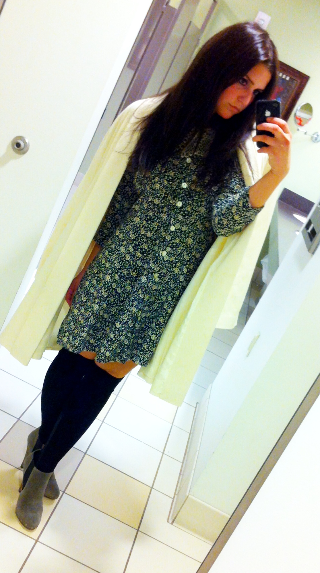 what I wore: dress – dby (thrifted), coat – preston and yorke via flying dog, socks – forever21, boots – dolce vita (thrifted), collar – urban outfitters