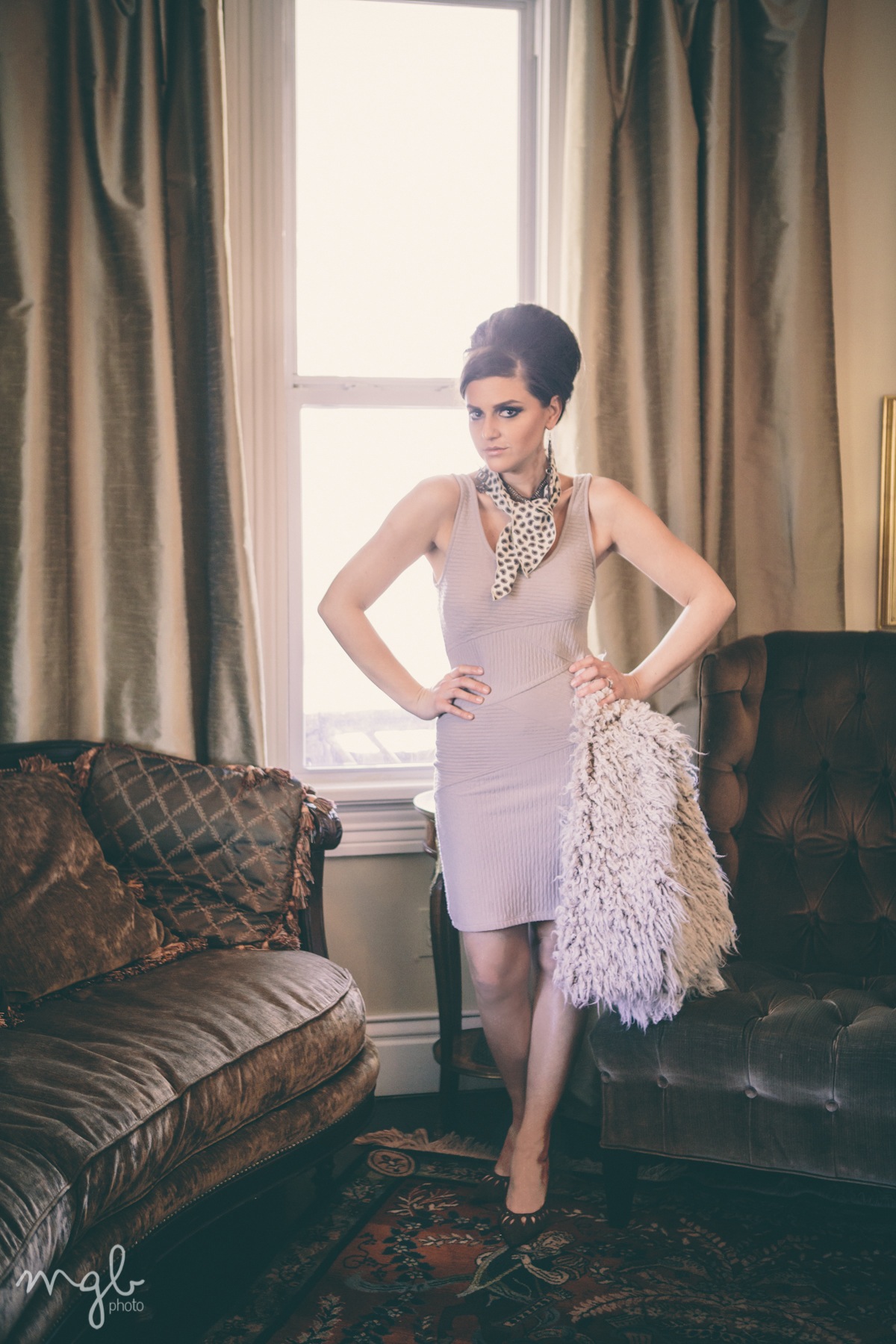 lato’s free people beige tank dress | worn with vintage scarf, bow Forever21 necklace/earrings, Michael Antonio heels, Bebe fuzzy (location: Dickson st inn)