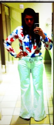 top – vintage from Potter’s house thrift, pants – old navy, booties – Vince Camuto, belt – Target, lips – Cover Girl Lip Perfection in Flame, necklace – vintage, watch – BCBG,