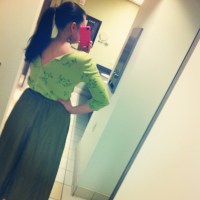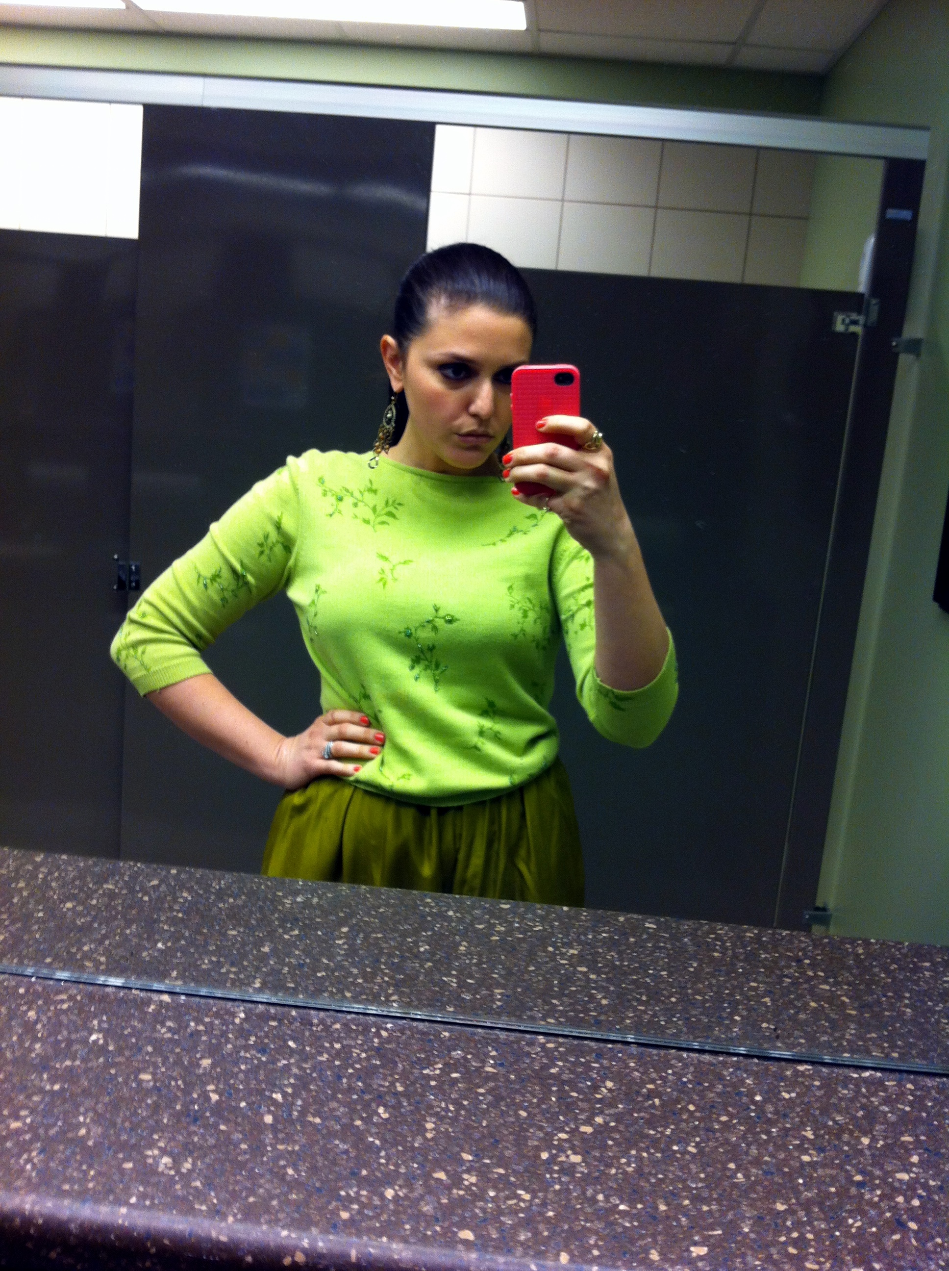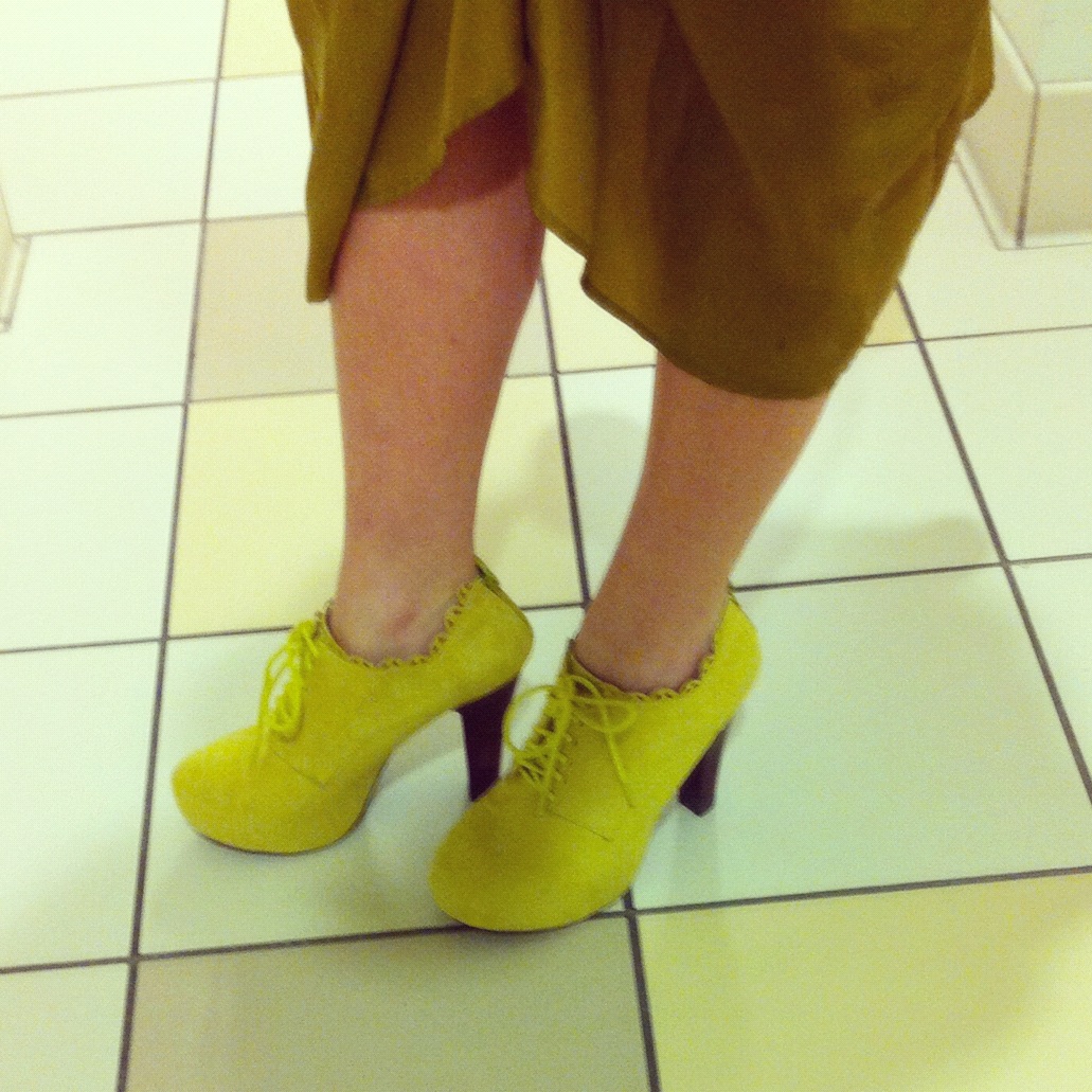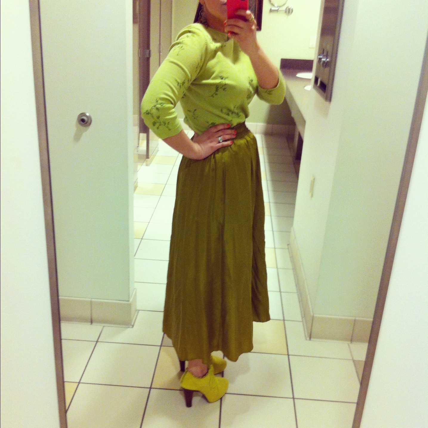 I’ve been dying to try this outfit out. It’s an old (see 1995) Express cardi worn backwards with a new-to-me vintage silk skirt from potter’s house. Topped off with neon green booties (called yellow on site) I just purchased at gojane.com. Go Jane has been such an exciting find for shoes lately! The prices are great and the heels are high! I also got these great orange high tops that I plan to wear with delicate skirts ala TTH & some giant tweed platforms in blue. Scroll for more photos!
