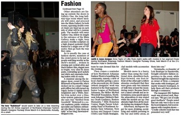 Helaine was sitting close to me at the show on Thursday night and we struck up a conversation. She was sent up by the Little Rock paper to cover the event. We exchanged contact info an she called me last week to chat about the shows. She was kind enough to share the above photo she took that “didn’t make the final version” in the paper. She had some very kind things to say about my Thursday look on the second page of the article and there are a few quotes from me as well.