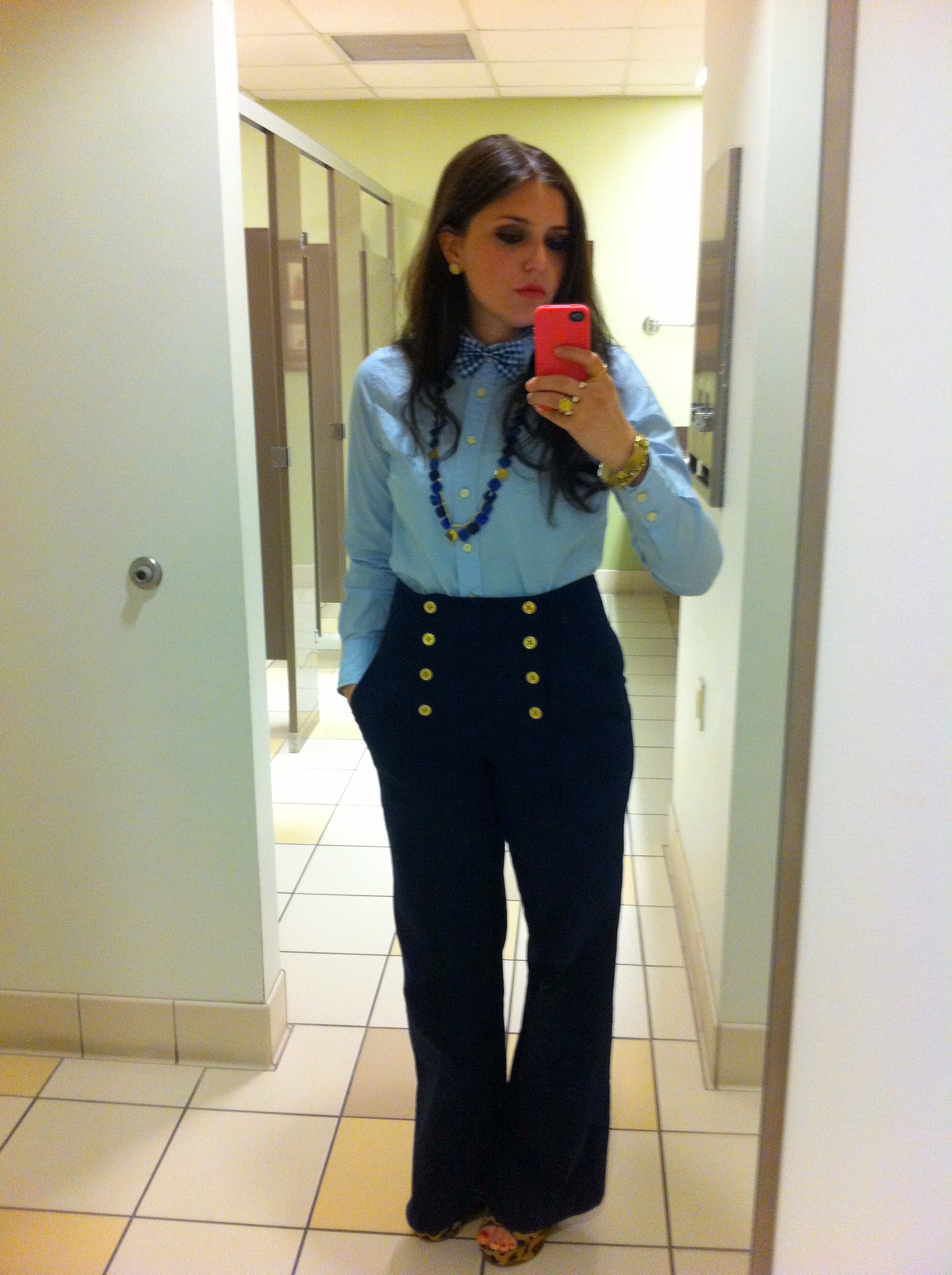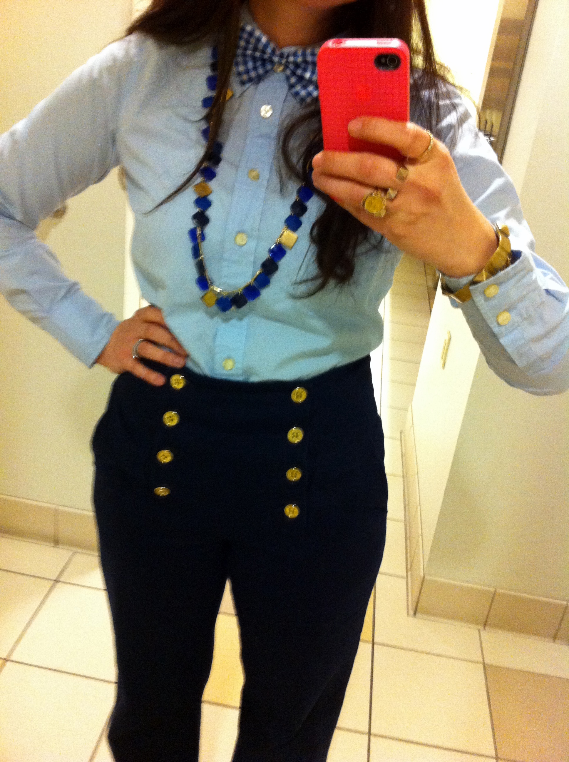 what I wore: trench – marvin richards, trousers – ralph lauren (seen here, here), blouse – old navy, bowtie – little boy’s at target, necklace – kate spade, platforms – steve madden, jewels – gifts, vintage, charm & chain, bcbg